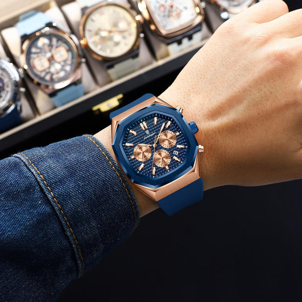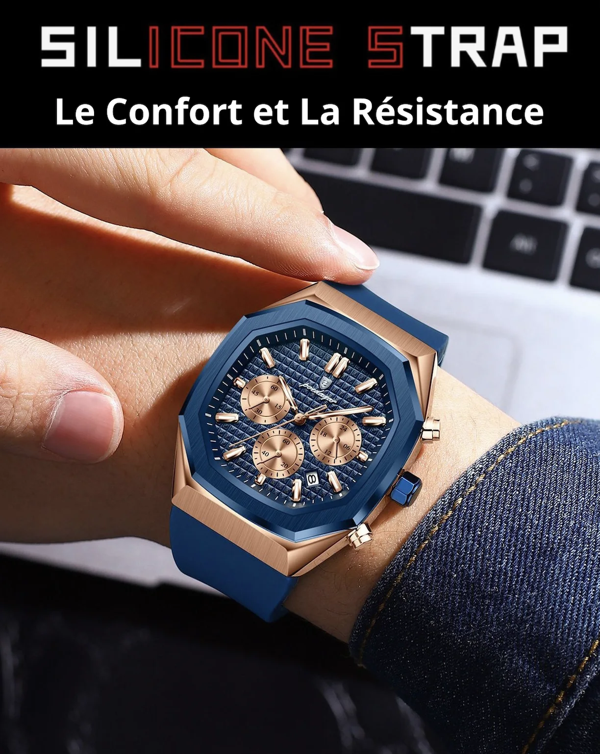Montre pour homme bleue avec bracelet en silicone, alliant style moderne et confort. Parfait pour un look décontracté et actif, il est résistant, léger et facile à porter au quotidien.